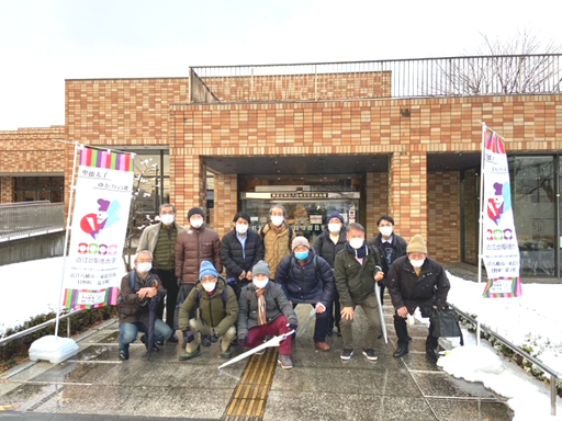( あいにくの雪空で、近江鉄道は無事運行されました。皆さん早い目の出だし。 )
